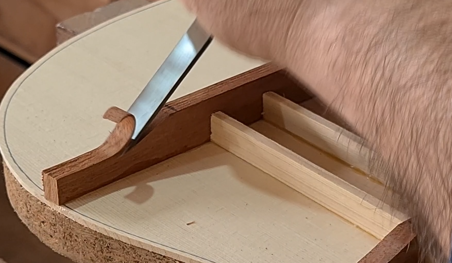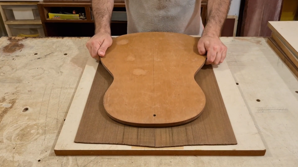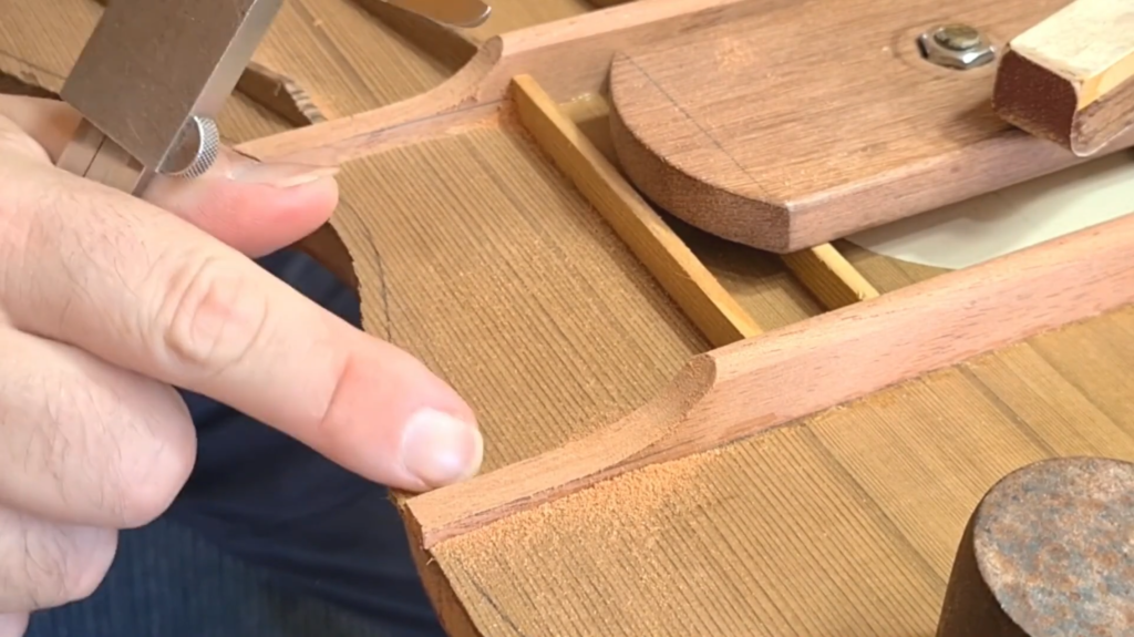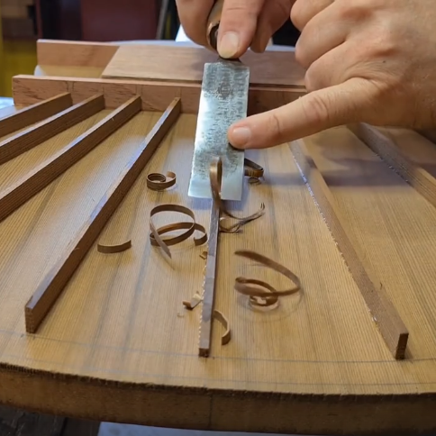 O que acontece? O luthier iniciante, com medo de deixar o tampo grosso demais, vai desbastando… desbastando… até que consegue a flexibilidade que imagina ser ideal.